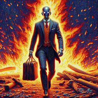Then at the window appeared a shadowy and hooded form amidst the rising inferno, one I struggled to discern through my smoke-teared eyes. It stood for a moment, as if in contemplation, and then stepped forward and reached an arm towards the edge of the door. To my amazement, the entire door was wretched bodily away, torn from its very hinges in a feat of near impossible strength; then hurled aside with the ease that a passing zephyr might fling a kite skyward.