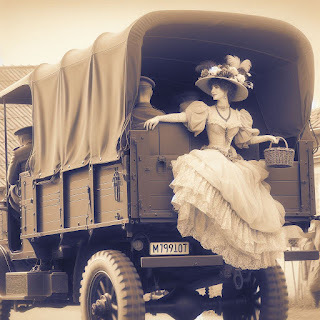 Chapter Thirteen: The Journey To Meet My Handsome RescuerOur journey to the village of the anarchists was hardly the sort of travel to which I was accustomed, and although one must make the best of any situation into which one is placed, it reminded me of how deeply I enjoyed my serene journeys in the Town Carriage. Our modest convey was comprised of two lightly armored vehicles recently purloined from the dead Caddiganites, followed by the two rattling anarchist jitneys. The truck into which I and Ernest had clambered was one of the latter, and the last of the four to depart, and was perhaps one hundred years old; it had obviously been repaired and rebuilt on so many occasions that its precise provenance was no longer discernible. I found myself in the canvas-covered rear area of the transport, where I had taken my place of honour on a crude bench that had been so thoughtfully bolted to the floor, a floor which was strewn with miscellaneous bric-a-brak, debris, booty from the Caddiganites, and what appeared to be several unsecured explosive devices. Everything about the truck was ad hoc, and that it could even move without collapsing into a heap of disparate parts seemed a minor miracle.