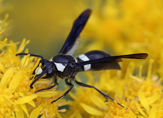 By later in the day the thick-fuzzed yellow-black body was an unmoving corpse, and the reason for its demise soon became apparent. I noted a new inhabitant entering the neat circular hole formerly belonging to the bee. It was a wasp, large, starkly striped and fierce of appearance. It was the obvious culprit, and had taken the bee's hidey-hole by force, a lethal winged conquistador.