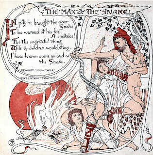 The purpose of the story of the snake...or "The Snake and the Man," or the "Snake and the Farmer," or the "Snake and the Maid?" It has been laid out and reiterated over the centuries of telling and retelling. The best of those retellings do not articulate the moral, because parabolic teaching means you're required to figure that out for yourself.