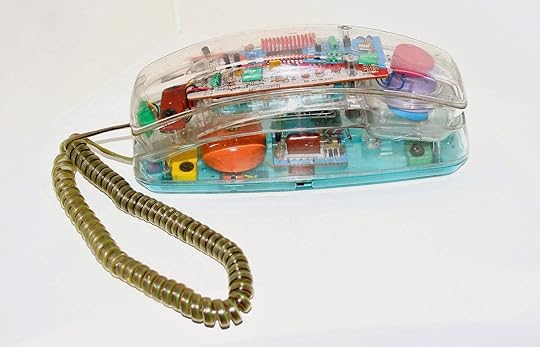 It's a corded phone, one that once hung on the kitchen wall at the apartment I shared with my then-fiancee. You can see the electronics and the circuit boards through the clear plastic, and all of the components are painted bright colors to create an artsyish effect.