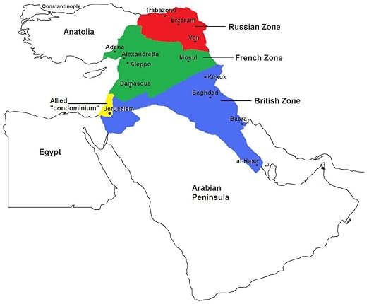 The most significant war-time treaty to be implemented inthe Middle East was the secret Sykes-Picot Agreement, where Britain and Francedrew up a plan to partition between them most of the remaining Ottomanpossessions, i.e. Syria and Lebanon to France, and Mesopotamia and Palestine toBritain*. As a result, following war’send, Britain and France took control of their respectivepreviously agreed territories in the Middle East. These annexations subsequently werelegitimized as mandates by the newly formed League of Nations: i.e. the 1923French Mandate for Syria andthe Lebanon, and the 1923British Mandate for Palestine. British control of Mesopotamia was formalizedby the Anglo-Iraqi Treaty of 1922, which also established the Kingdom of Iraq.