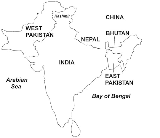 India and Pakistan. Diagram shows India and the two “wings” of Pakistan (West Pakistan and East Pakistan) on either side. Kashmir, the battleground during the Indian-Pakistani War of 1947, is located in the northern central section of the Indian subcontinent