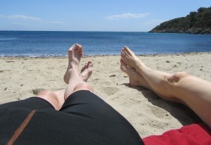 And then there’s the coast. Tourist season is coming up soon, so my wife Susan and I decided it would be much smarter, not to mention cost effective, to travel to the beach now rather than later. Here’s a picture of us on the sand of Sardinia.