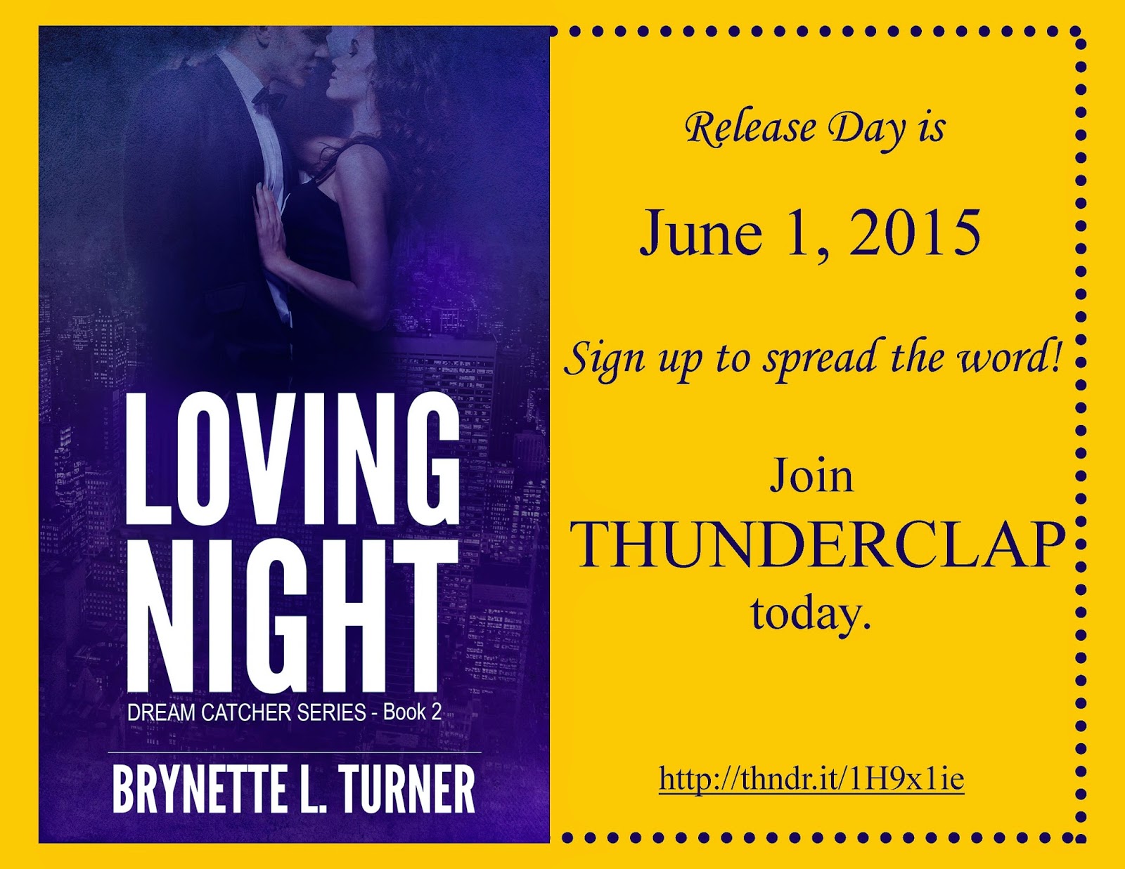 What is THUNDERCLAP? It's a way to introduce an event to a large group of people at one time. I'm using it to herald the release of Loving Night: Dream Catcher Series - Book 2. All you have to do is sign up (a widget is conveniently located on this home page). At noon on May 31st, the message I've created will...