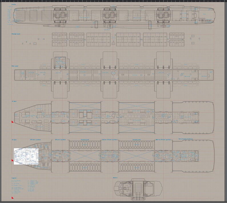 Even that simple exercise was a bit of a headache until I developed a technique to handle positioning. With such a large drawing, when you zoom out far enough to see the whole deck you are too far out for accurate positioning. And at that distance I also found it next to impossible to “grab” a set of lines I’ve just pasted to drag them into position. My solution was to add some temporary drawing elements to help move and position. You can see one or two red triangles nestling in the corners of my grid. I select the items I want to copy, along with one of these triangles. When I paste into the next deck, the large triangle is easier to grab while zoomed out, so I can get things roughly into position. I then zoom in on the triangle and nudge it until it is precisely positioned against the grid lines and I know everything else - out of sight because I’m zoomed in - is also moving with it into correct alignment.
