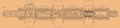 In this view, you can see that most of the ship is taken up by the two main machinery spaces.