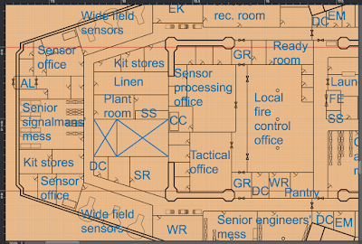 Of course, there’s also a lot of stuff needing to go into that space, but I had to start getting pretty inventive thinking through all the possibilities that might be required in a fighting ship with a crew of six thousand, isolated from planets and bases for months at a time. I had to be fairly generous in my use of space, without making it look too generous. So I carved the deck up into lots of small compartments, and assigned functions to them as creatively as possible while making it sound and look credible.