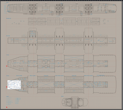 Again, this benefits from some forward thinking. I started off with the main structural framework of the ship - keels and horizontal and vertical plates. Again, I put these into a drawing layer of their own for easier handling. Making this ship a fairly boxy shape helped, because there was a lot of repetition from one deck to the next. Once I had worked out the parts of the framework that pierced one of the main decks, it was a matter of copying and pasting to the others.