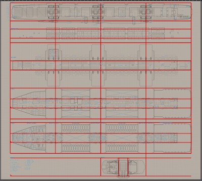 You can see that the plan is actually a series of plans - mostly decks, but also profile and section. Laying these out on the page needs some forward planning. I decided on the overall dimensions for the different elements and then worked out how much room each one needed on the page - not so close that they overlap, but not too far apart either. I then laid out my own large scale grid lines to mark out the boundaries. I put these in their own drawing layer behind everything else so they are visible but don’t interfere.