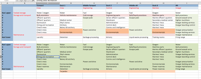 Here I set up a spreadsheet to mark out zones along the length of the ship, and decks down the page.