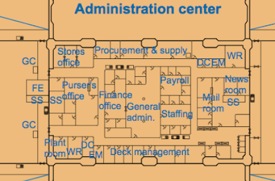 The administration office is part of a sprawling suite that includes stores and supply, procurement, finance, payroll, HR, as well as a mail room and the ship’s own internal news room.