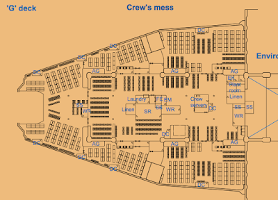Most of the ship’s crew of roughly 6,000 bunk down in the three main mess decks occupying the forward lower section of the ship. Here is the plan of the “G” deck mess where Shayla stows away.
