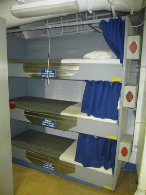 Most of it is given over to rows of bunks and lockers, a cramped labyrinth with occasional more open spaces for mess tables. The bunks are in sets of three, much like this shot from a real battleship.