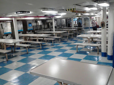 Each of these decks includes shower and washroom facilities, laundry drop-off and pickup points, and a servery linked to the kitchens a couple of decks above by a hoist. While many crew members might choose to eat down in the mess decks, they also have access to a large canteen, open all hours, in the middle of the main recreation area.