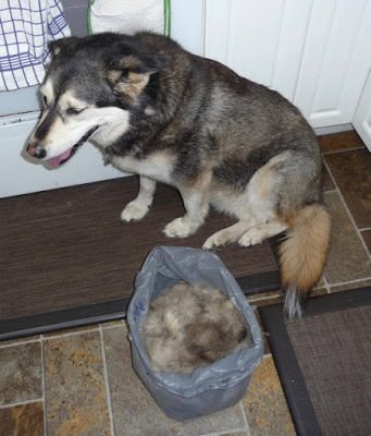 After the sunshine last week, Gypsy finally decided to start shedding her winter coat. Yes, that is a full carrier bag of fluff I combed out in a couple of ten-minute sittings, and there's more to come out yet!