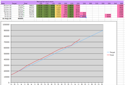 Back in February I picked up the smattering of rough scenes I’d written a few years ago, and set myself the goal of hitting 90k by the end of August. That works out at a little over 400 words a day. Not much by many writers’ standards, but with other commitments it’s a stretch for me to sustain day on day.