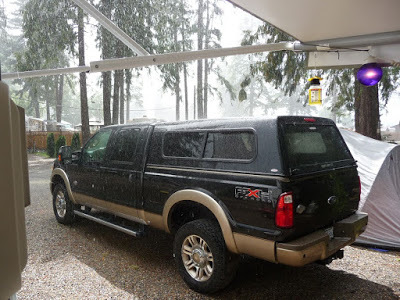We normally have everything unpacked and camp set up inside an hour of unhitching the trailer. This time, we had to take a stroll through a nearby park to collect our thoughts before tackling the question of how to lay out our living space. Eventually, we squeezed Megan’s tiny tent into the gap between our trailer and our neighbors, and set up picnic table and cooking area around the hitch at the front instead of alongside the trailer. It was cramped, but workable.