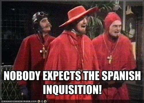 *Looks around shiftily, expecting the Spanish Inquisition*