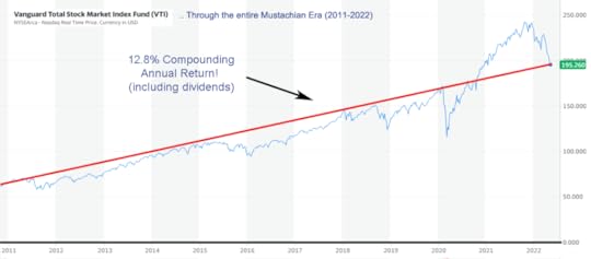 What if we decided to be more sensible, start the damned Y axis at zero as every graph should do, and zoom out to a reasonable time horizon,such as the Age of Mustachianism which happened to begin in 2011. And ignore the wiggly blue line and follow the more meaningful red line.