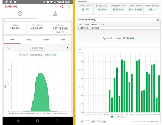 At the time of writing, I’ve had the system online for 27 mostly-January days, including a couple of writeoffs where the panels were covered in snow. It has still averaged about 10 kWh of electricity production per day, which is more than the average consumption of the whole facility. Put another way, the 265 kWh of electricity is enough to power an electric car for roughly 1000 miles of driving.