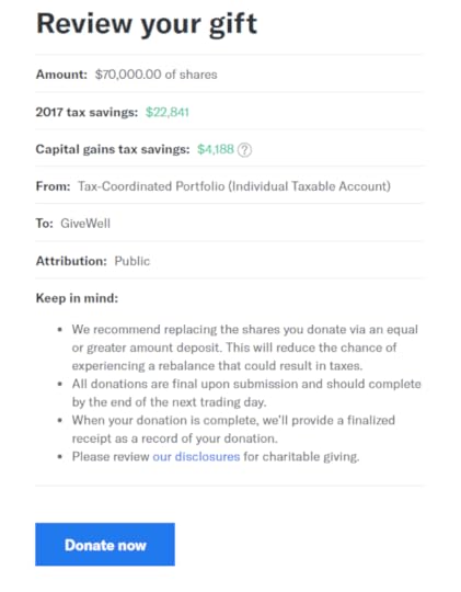 Betterment Investing just added a spectacular no-cost automatic donation feature. Using their existing tax-optimized system, they allow you to donate your most appreciated shares directly to any of their many connected charities. This gives you the maximum tax deduction right now, while reducing your taxes further when you later withdraw from your account later in life.