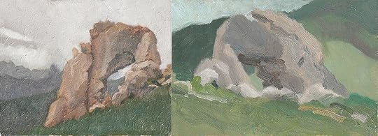The rain slicked oil pigments dripped off the panel into my cold paint box tripod as I huddled under a covered relic in the city center of a former miner town. A nearby man verbally assaulted his dog like something out of “Waiting for Godot” while an elderly woman who passed by earlier on her bike returned with a book to tell us stories of the town and her youth.