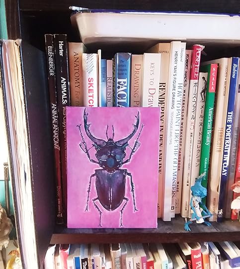 The key for getting expressive with the brush strokes is using as big a bush as possible. I personally love using flat brushes. I work the strokes as if I were sculpting the form of the body in paint. The background color went through a few stages until Magenta just made all the sense in the world.(my nieces texts confirmed this truth) I then created a white halo around the beetle because Egon Schiele was whispering in my ear that day.