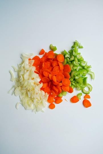 heat the olive oil in a heavy-based saucepan. roughly chop the onion, carrot and celery and add to pan. season, cover and sweat for several minutes until they begin to soften.