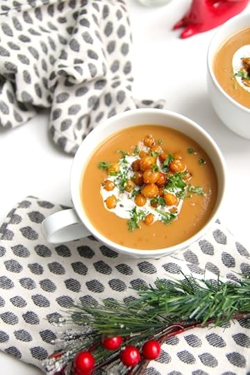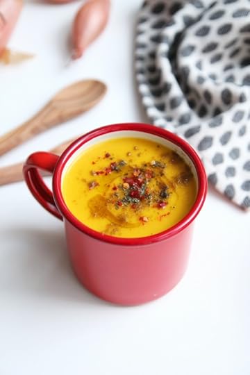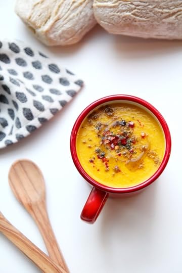 Because we won’t be home until next week, I’ve been desperately trying to use up all the odds and ends in my fridge that won’t keep. I’d been craving comfort food anyway so this soup was an obvious choice given the bag of sad looking carrots in my veg drawer … yes, it’s just a silly old soup but by golly did it hit the spot. Lightly spiced (cumin and coriander, bam!) with an added bit of depth courtesy of some coconut cream, this is perfect ‘curl up on the sofa’ fodder – and what better way to consume this warming golden liquor than in a cup. No spoon necessary. Get sipping.