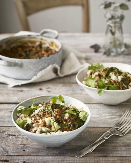 7. Add almost all of the coriander to the pan, reserving a little for a garnish. Once the sauce has sufficiently reduced and the spinach leaves have wilted, serve over a bed of brown rice with a spoonful of the cucumber and coconut dressing.
