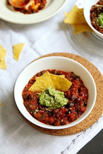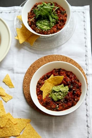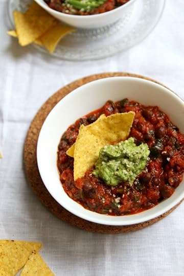 divide the chilli between 2-3 bowls and top with sliced or mashed avocado, a smattering of hemp seeds and a side of tortilla chips.