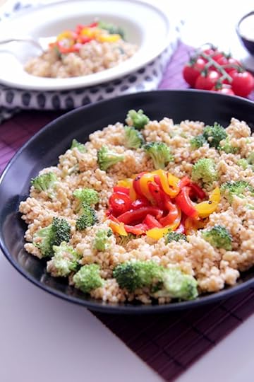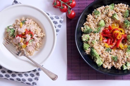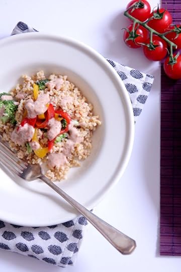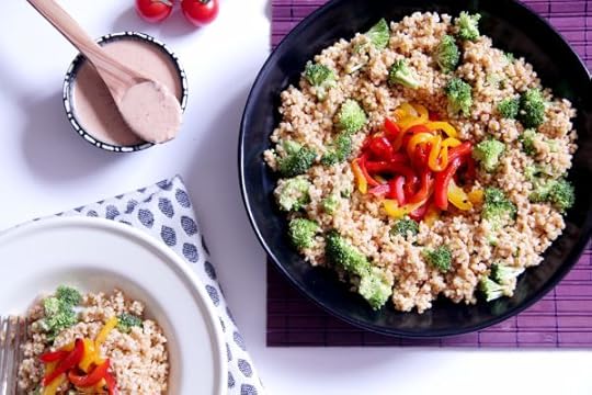 Cut the broccoli into small bite-size pieces (keep any remaining stalks for soups and stews) and begin assembling your bowl. I used a large platter-style bowl, placing the roasted pepper strips in the centre before spooning the bulgar wheat around the outside. Dot the broccoli florets here and there, and serve with the remaining sauce.