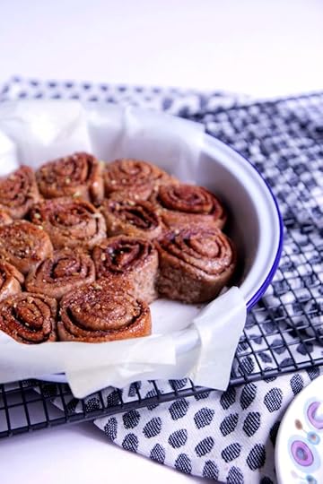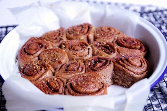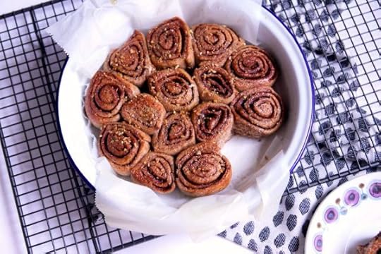 I made them a couple of times and tested out two varying methods to figure out which one I preferred. Needless to say my Husband’s opinion differed from mine, which only made things a tad more confusing, so I packed him off to work with his favoured batch and I’ve kept these mini ones for myself. The main points of difference were the point at which I added the yeast and when I chose to knead the dough. For the mini rolls, I added the quick acting yeast to the dry ingredients before gradually pouring in the almond milk and oil. After bringing it together into a rough dough, I then tipped it out onto a floured surface before kneading for around 10mins until it was reasonably smooth and elastic … oil it, place it back in the bowl, cover with cling and set aside in a warm place (tip! I put it beside my pre-heating oven) for around 30mins. So far, nothing unusual there. The dough will expand, not massively, but it will be noticeably bigger and at this stage I rolled it out very thinly (less than 1/4 inch), brushed over my oil and generously sprinkled it with ground cinnamon and light brown sugar. Roll it tightly into a long but even sausage shape before slicing into rolls (about 2cm thick). Line a round oven-proof tray and arrange the rolls with the coil facing upwards – it might be a squeeze but that’s fine. Set aside for a further 20mins before baking in a hot oven for 10-15mins. They won’t rise a huge amount but will have a beautifully crispy yet light texture – almost like the central piece to their regularly sized counterparts, which, let’s face is usually the best bit anyway. This is probably why I liked them so much! As soon as they come out of the oven, brush them generously with maple syrup and sprinkle over some crushed nuts or seeds – et voila, mini spelt cinnamon rolls ready to eat.