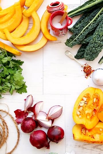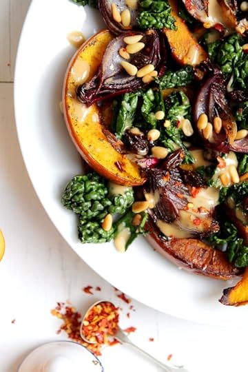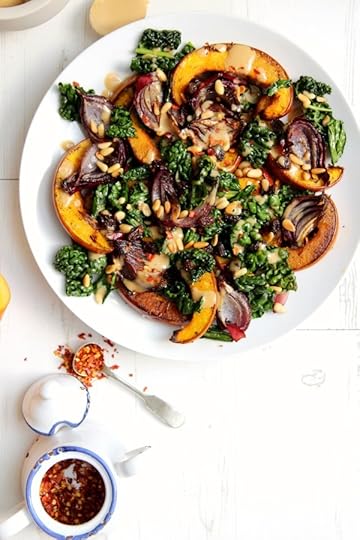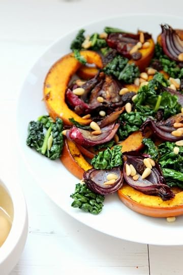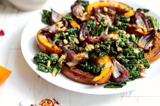 It’s officially pumpkin time and I’m getting in early this year with a savoury dish that will knock yer socks off. There are so many ways to serve pumpkin but I adore it simply roasted and served in a warm salad alongside a few of my other favourite seasonal ingredients … cavolo nero being just one! There’s certainly a lot happening in this plate (what with the crunchy toasted pine nuts, chewy raisins and creamy tahini, maple dressing) but each component plays a vital part in bringing these incredible ingredients together in one harmonious plate of yum. I honestly can’t think of a better way to welcome in this most glorious time of year – almost like a gentle farewell to Summer and a fond hello to Fall.