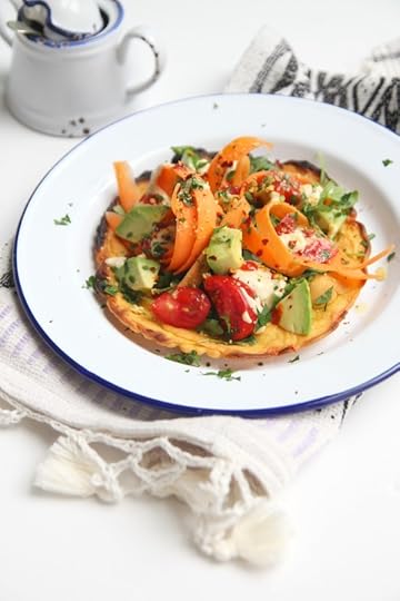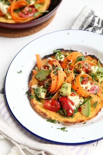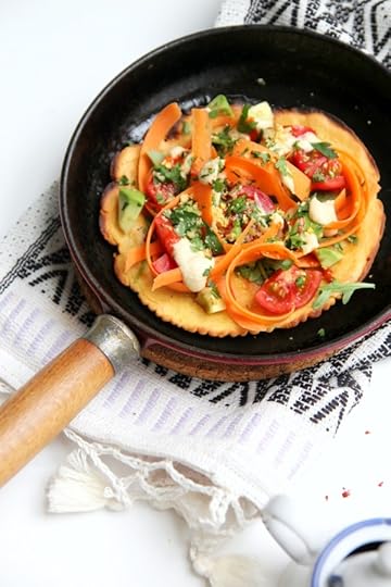 In the meantime, there’s always pudla. There’s a similar recipe in my book ‘Keep it Vegan’ but this is a new and equally yummy version … the batter is much thinner and technically speaking, it’s probably more of a socca than the former. Fried until crisp and then whacked under a grill, it renders the perfect base to make a pizza – of sorts. Truthfully, I couldn’t be bothered to get into making a full-on sauce so all the toppings are raw – carrot ribbons, roughly chopped tomato, diced avocado, rocket and a whole other array of tidbits that make up this moreish dish. Whilst it makes for a perfect lunch option (you could totally eat it cold at work), I think it would be nice served as a ‘nibble’ at a dinner party – just make sure to quarter them for ease of eating. Plus, they are so wonderfully vibrant, they’re sure to be a little talking point – and a certain mood lifter … just what I happen to be in the market for, ahem. What else can I say – the time to up your pudla game is now!