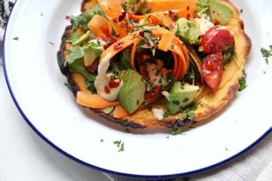 layer up the topping, starting with the rocket and followed by the carrots, tomatoes and avocado. dollop over the hummus sauce and finish with a smidge of sriracha, smattering of nutritional yeast and a few chilli flakes. lightly season and serve.