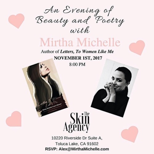 So excited to collaborate with one of favorite skin havens @theskinagency for my next @letterstowomenlikeme event! Join us 2 weeks from tonight on Wednesday November 1st for an evening of beauty and poetry. The event is free, simply RSVP at Alex@MirthaMichelle.com