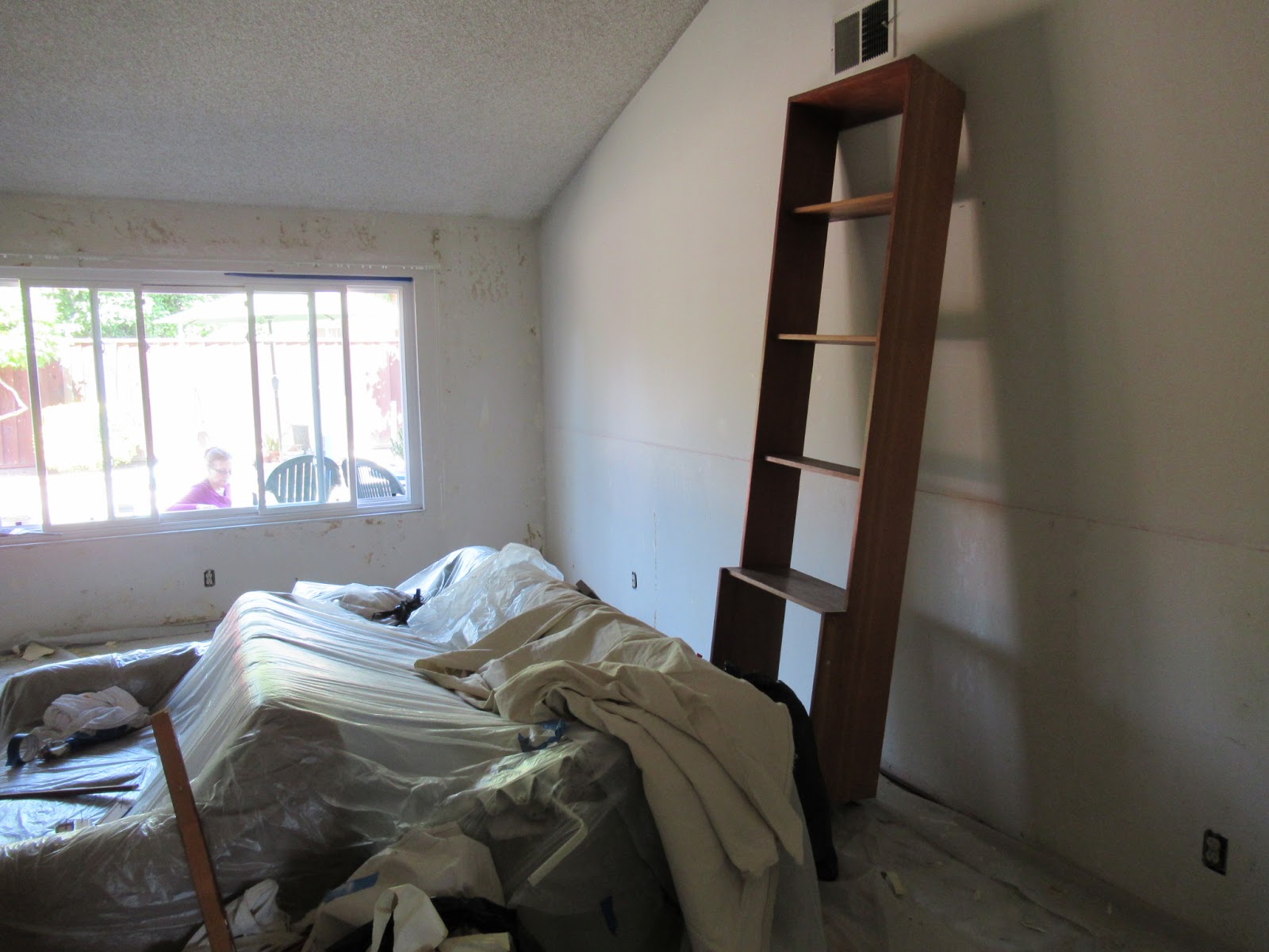 The two brown shelf units, leaning against each respective wall, were originally mounted in each corner of the room, to the left and right of the window. Those brown bookcases now have a white primer, and will eventually be painted "bone" to match -- and blend in with -- the walls.