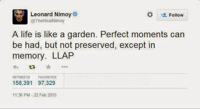 We remember him as Spock, and Spock Prime, in the Star Trek franchise; and as Dr. William Bell in about a dozen episodes of Fringe. And for a hundred thousand-plus Twitter followers, Leonard Nimoy will be lovingly remembered for his very last tweet: