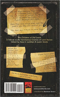 anthology -- the newest title from publisher Word Horde -- I also recommended at the time that readers opt for the Deluxe Pack available direct from the publisher's web site. As only 100 numbered Deluxe Packs were made, they sold out fairly quickly. I'll post some of the items below, but keep this in mind in the future: When Word Horde offers a deluxe package for one of their books -- snag it!The Children of Old Leech (TCoOL) isn't just another themed anthology. The book's subtitle is the reveal: "A Tribute to the Carnivorous Cosmos of Laird Barron." That previous blog post I mentioned above has some of my thoughts on Laird Barron and TCoOL as well as a list of the book's 17 stories. But a list of stories is just that: a list.