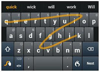 As you swype the keyboard a trail is created to show the path of your finger/stylus. In this example, the word being swyped is "quick," which appears in gold in the top left of the keyboard, along with other possible suggested words. If "quick" is the correct word, you can simply move on to the next word. Swype will "learn" your vocabulary and even anticipate the word you might want to use next. As I use Swype more and more, I am continually amazed....