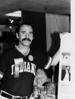 The photograph in which George Alec Effinger is wearing his Cleveland Indians shirt was taken in 1986 by Carolyn F. Cushman and is reprinted here with the kind permission of the photographer, and Charles N. Brown [June 24, 1937 – July 12, 2009] and Locus magazine. Effinger was born in Cleveland in 1947, and was always a huge sports fan, and an Indians fan in particular. In fact, his entire collection Idle Pleasures (Berkley Books, 1983) is comprised of science fiction sports stories.