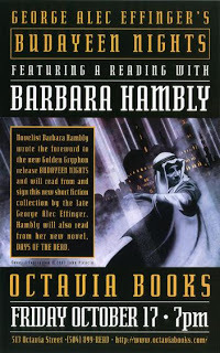 One thing more... After Budayeen Nights was released, author Andrew Fox arranged a memorial reading from the book; the event was held at Octavia Books in New Orleans on October 17, 2003. Barbara Hambly was in attendance, as was NO author Laura Joh Rowland, in addition to Andy Fox and others. You can read about the event in more detail in Fox's "Remembering George Alec Effinger"4 -- a nearly 8,500-word essay that Andy had originally posted on his web site, which, sadly, is no longer active. And as you can see from the accompanying graphic, artist John Picacio most graciously donated his time to create an 11" x 17" poster to advertise the event; enough posters were printed to hang in the bookstore as well as in key locations around town.