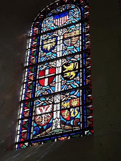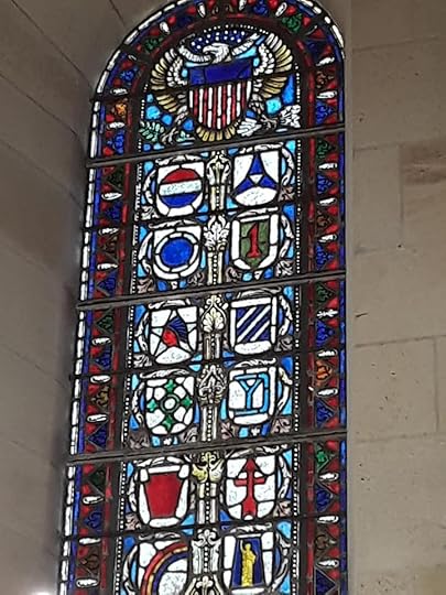 One of the stained glass windows inside displays the insignias of American divisions engaged in the area. Another window has the crests of countries on the Allied side of the war.