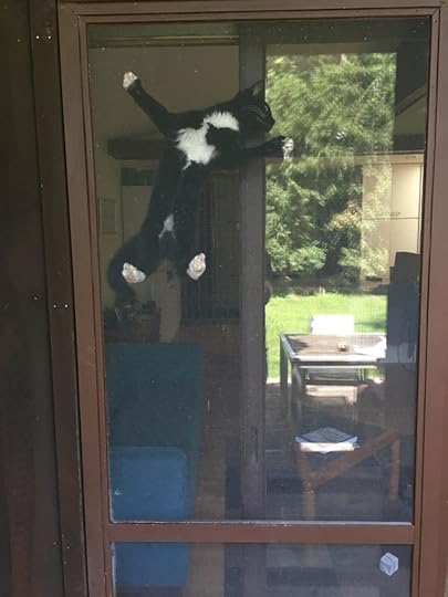 Toby climbs screen door, hangs, shows off his tuxedo.