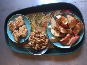 My friend Erin runs a Montessori preschool. They teach the toddlers to set a table at lunchtime with plates, silverware, and cloth napkins. Erin models this tendency of taking a little more care with the everyday. I thought of her yesterday when I had a visitor, so I arranged this tray. Simple, but a little brighter than your average hummus tub (p.s. I think Hummus Tub would be a great wrestling name).
