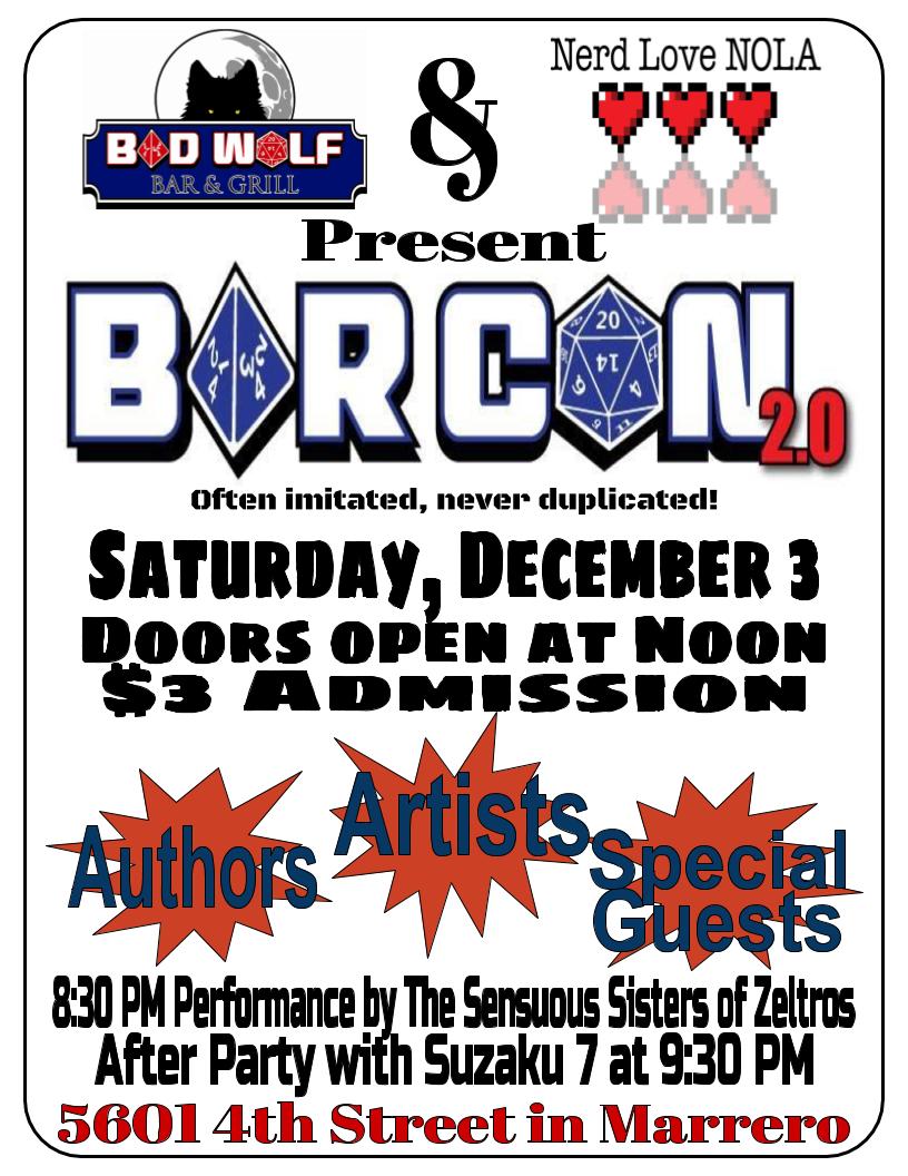 I'll be a guest author at Bad Wolf Bar & Grill's Barcon on December 3rd! I'll have bookmarks, posters, and other Lucid goodies to hand out! Be sure to dress as your favorite comic book, sci-fi, fantasy, or anime character and I'll see you there!