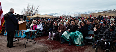 The week that turned January to February was a busy one around here. Or, not around here, as the case may be.On January 29, we boarded a bus with a group from Utah Westerners and traveled north on the more-or-less same trail Colonel Patrick Edward Connor took with his cavalry troops in 1863 on a mission to seek out and destroy a Shoshoni winter camp—and the people there.Every year, the Northwestern Band of the Shoshone Nation, descendants of the few survivors of the massacre, meet on the killing field to remember the fateful day. And they gracefully host all interested parties who care to join them. One newspaper report estimated this year’s crowd at 500. Larry Echohawk (pictured), former United States Assistant Secretary of the Interior for Indian Affairs, offered the keynote address.I have written widely about the Massacre at Bear River, the latest effort being a novel based on the horrors of the day. When released in 2021, It will carry the same title as a song I wrote the lyrics for, “And the River Ran Red,” by the great Western singer Brenn Hill. Brenn was at the ceremony and, as he did last year, sang “And the River Ran Red.” The Northwestern Band of the Shoshone Nation, under the direction of tribal chairman Darren Parry, is in the process of creating the Boa Ogoi Cultural Interpretive Center at the site. Your financial support will help. Donations of any size are welcome. Thank you.