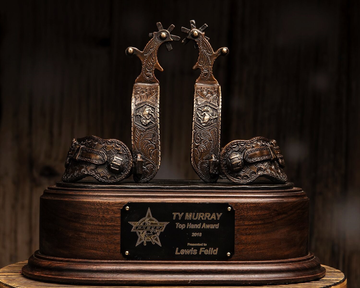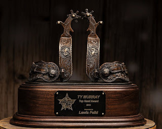 Many of you are familiar with Cowboys & Indiansmagazine. It’s a slick, upscale periodical that covers entertainers, travel, food, shopping, and other people, places, and things around the Western states. The current issue focuses on Texas, including a feature story on rodeo legend Ty Murray. Included in the feature is a sidebar I wrote about the Professional Bull Riders Ty Murray Top Hand Award, an award created to honor bull riding’s roots in rodeo, and recognize cowboys who are not bull riders and have made a significant contribution to the sport. The handsome award itself, modeled on a pair of Ty Murray’s spurs, was designed and sculpted by my friend Jeff Wolf. As you see, it’s a real work of art. Recipients of the award will no doubt be honored to display it. Get a copy of Cowboys & Indians and read all about it.